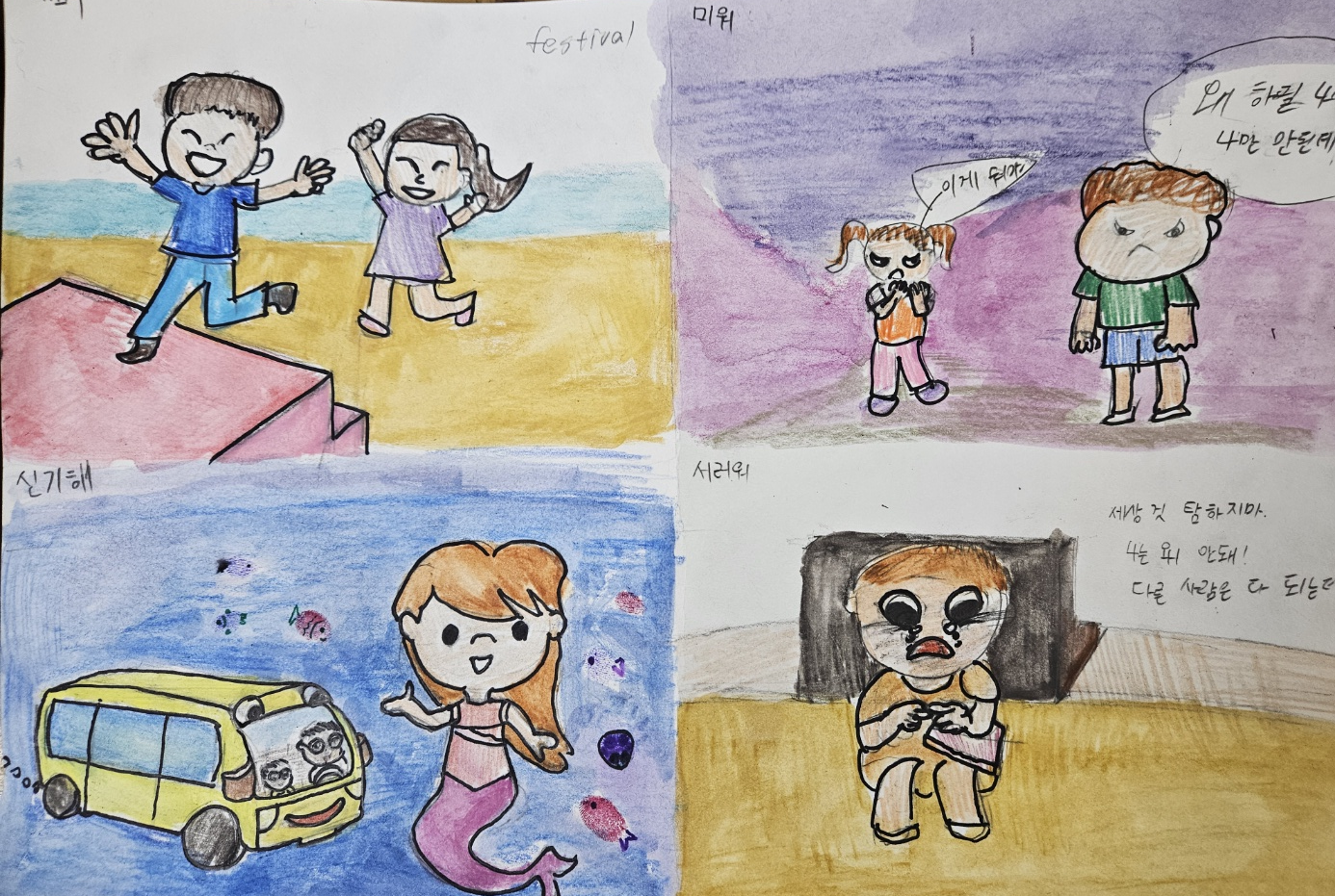 - 친구와의 의견 충돌 속에서 느끼는 서운함, 억울함을 말풍선과 찌푸린 얼굴로 표현했습니다.