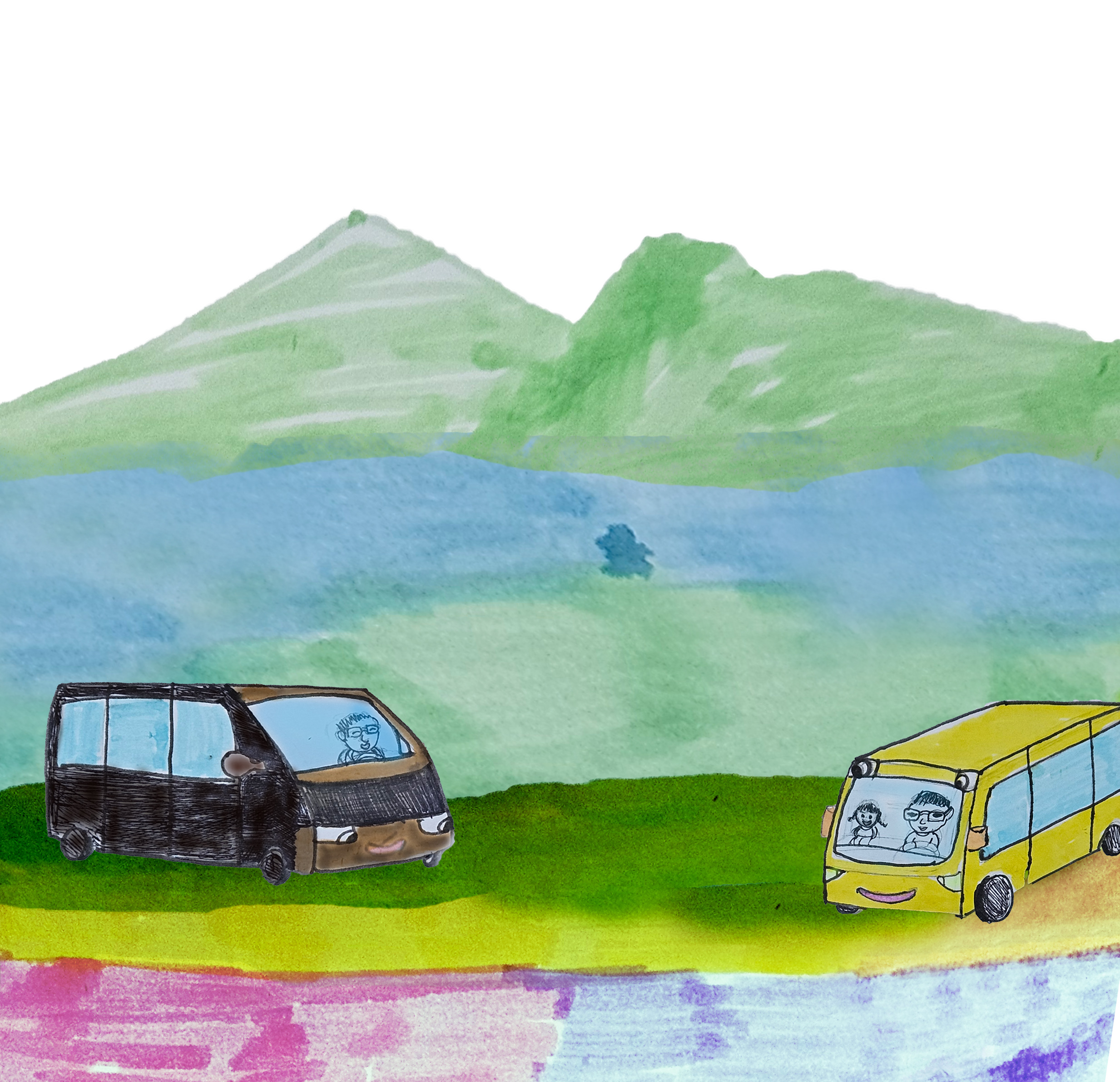 다른 한 대는 사회복지사가 아이들을 데리고 물놀이 온 모습을 그렸습니다.
